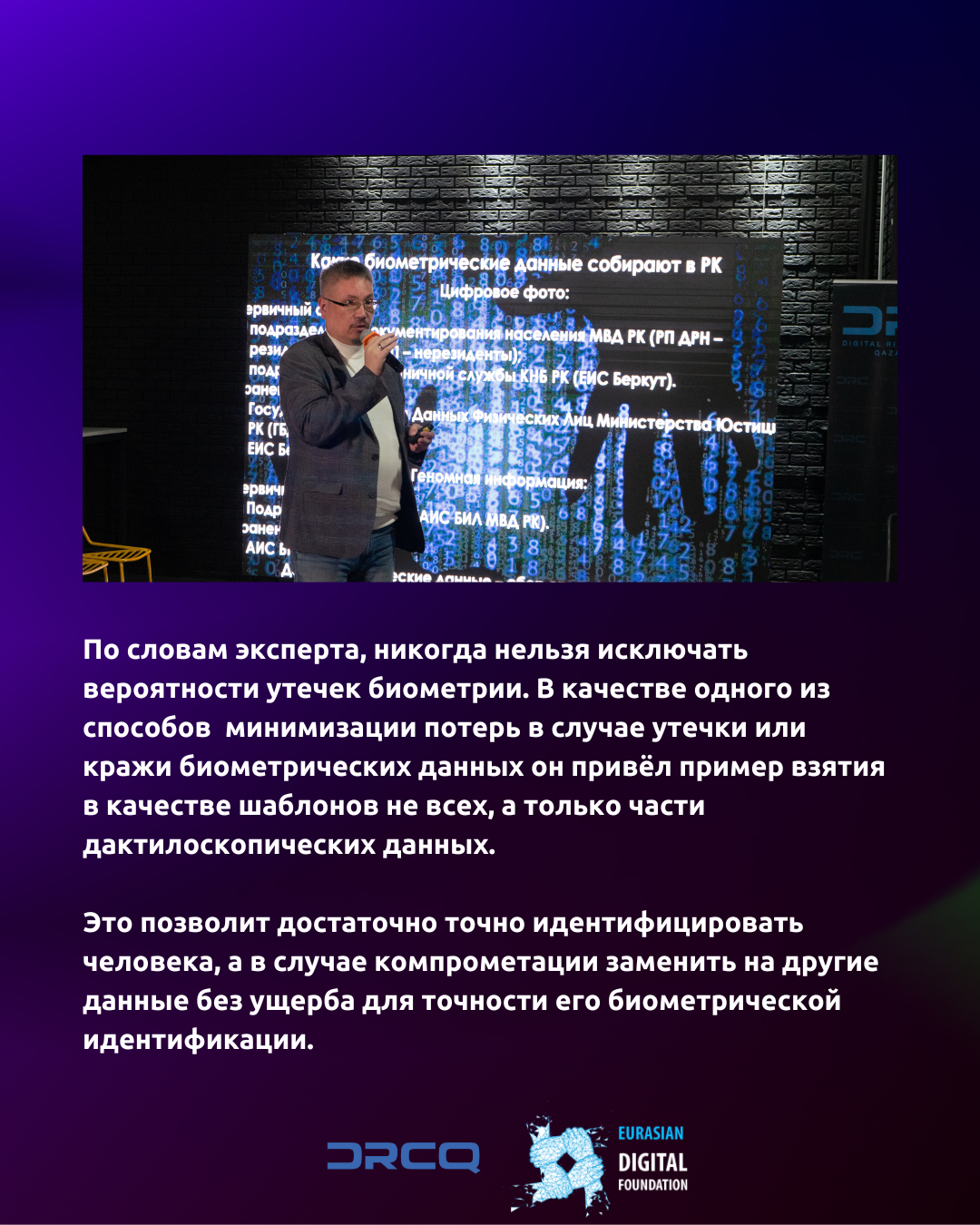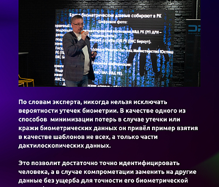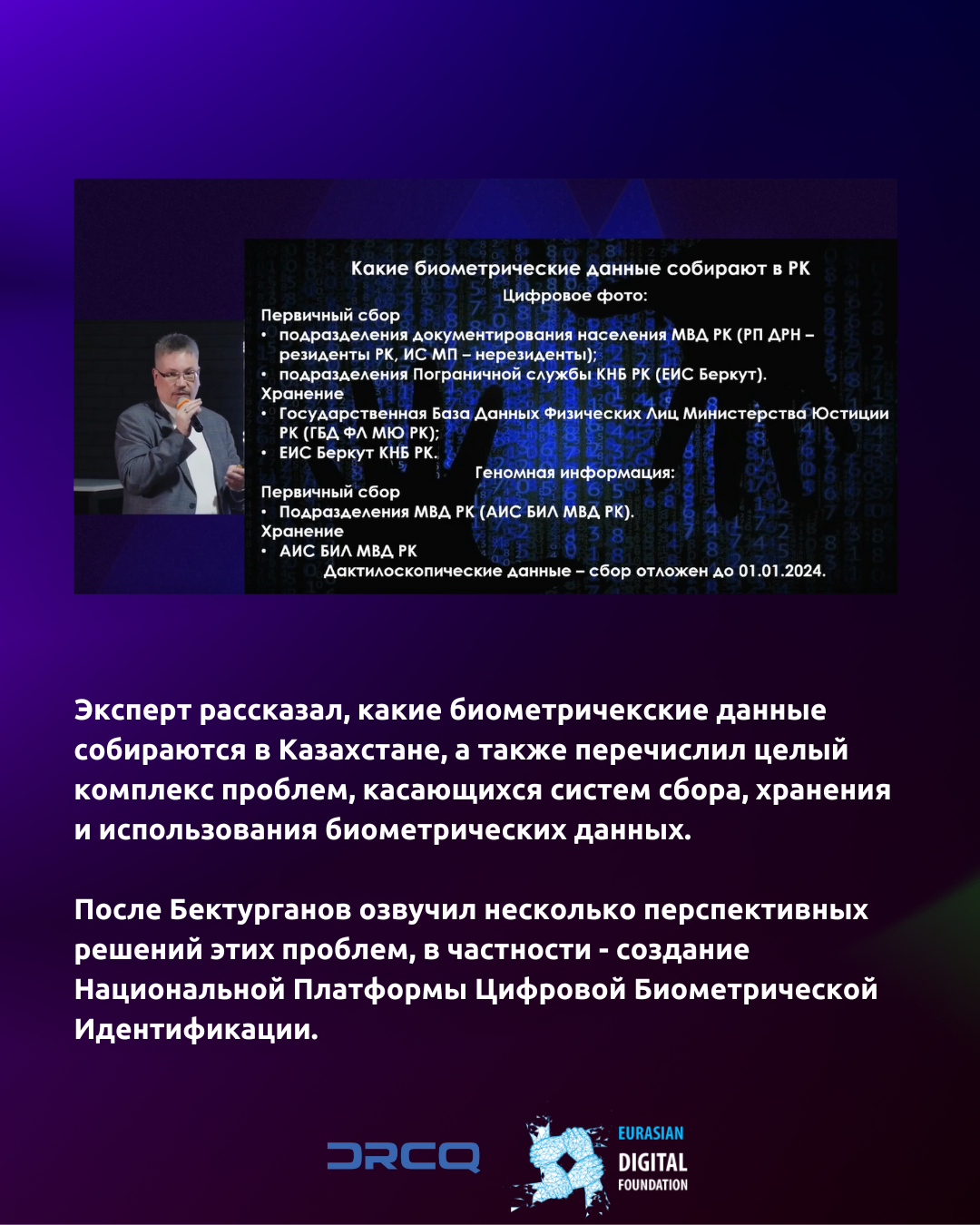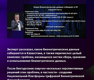 В связи с этим Данила Бектурганов озвучил несколько перспективных решений озвученных выше проблем. Одним из главных является осуществление программы создания Национальной Платформы Цифровой Биометрической Идентификации, включающей систему сбора и миграции данных, контрольную биометрическую систему, операционные базы данных, платформу биометрической верификации и систему управления согласиями на сбор и обработку данных.