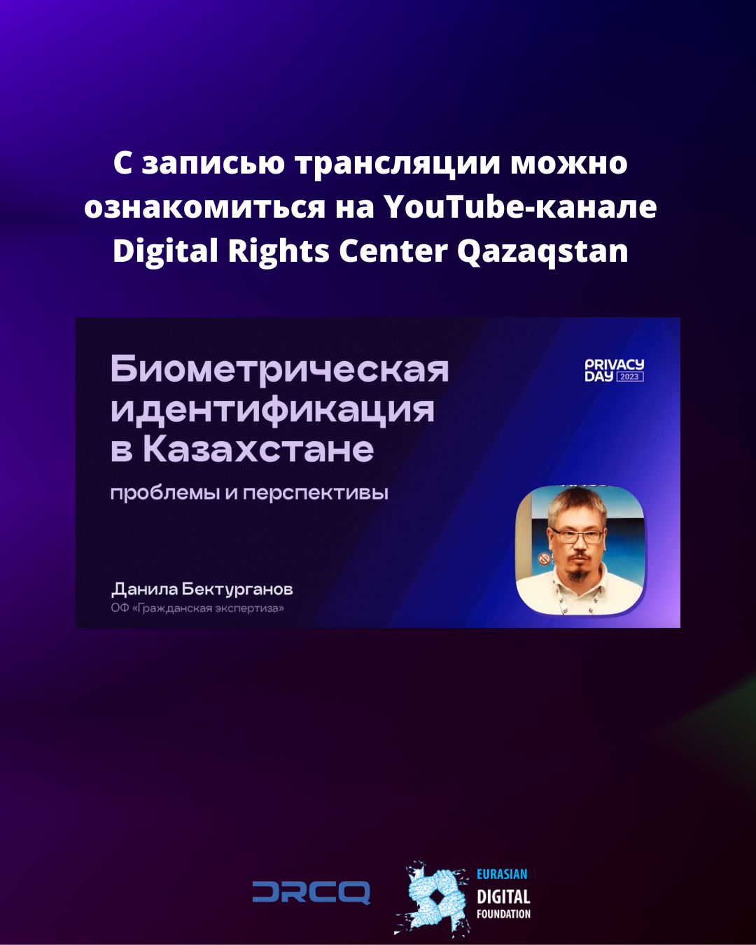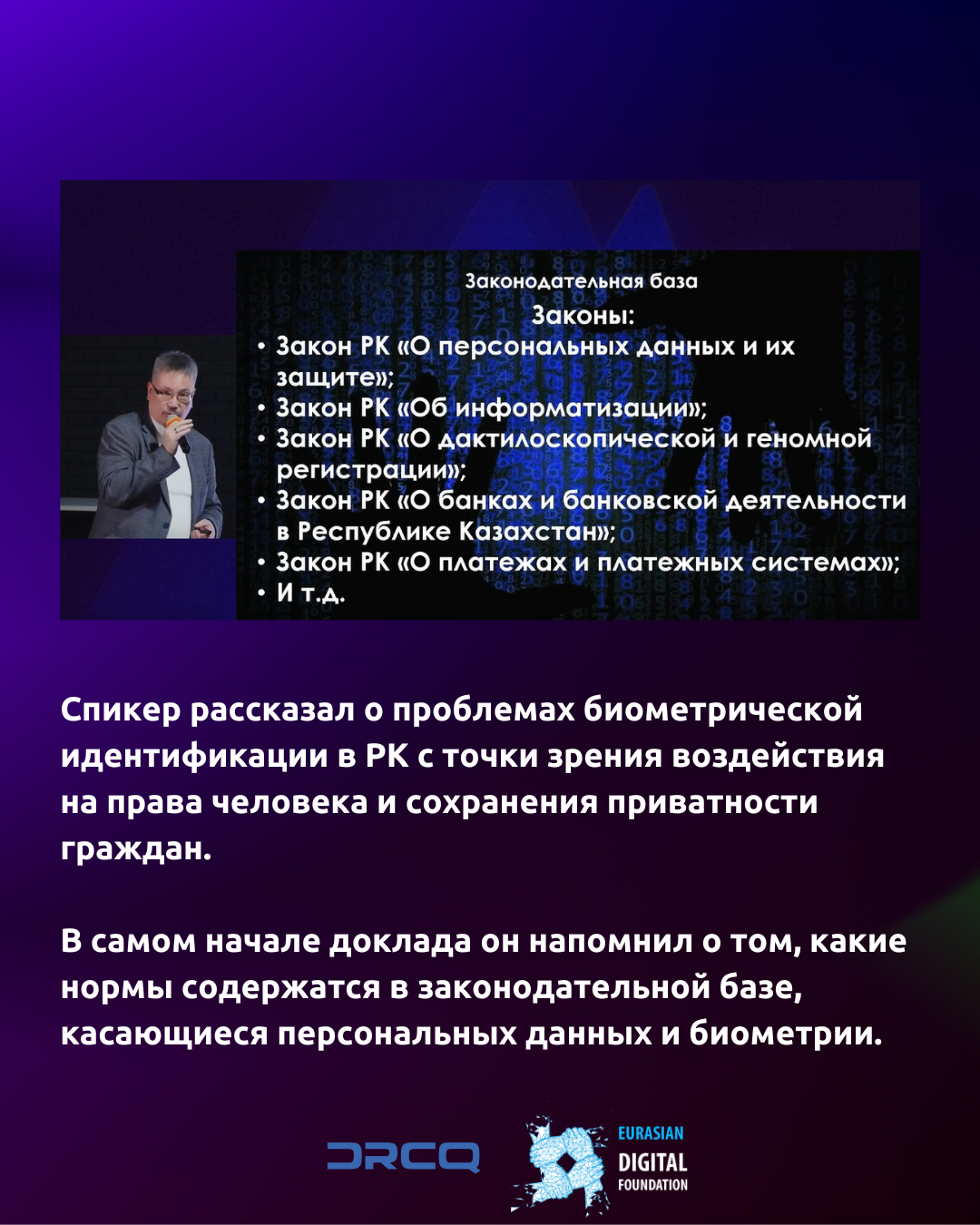 Данила Бектурганов, президент ОФ «Гражданская экспертиза», рассказал о проблемах биометрической идентификации в РК с точки зрения воздействия на права человека и сохранения приватности граждан. В самом начале доклада он напомнил о том, какие нормы содержатся в законодательной базе, касающиеся персональных данных и биометрии.