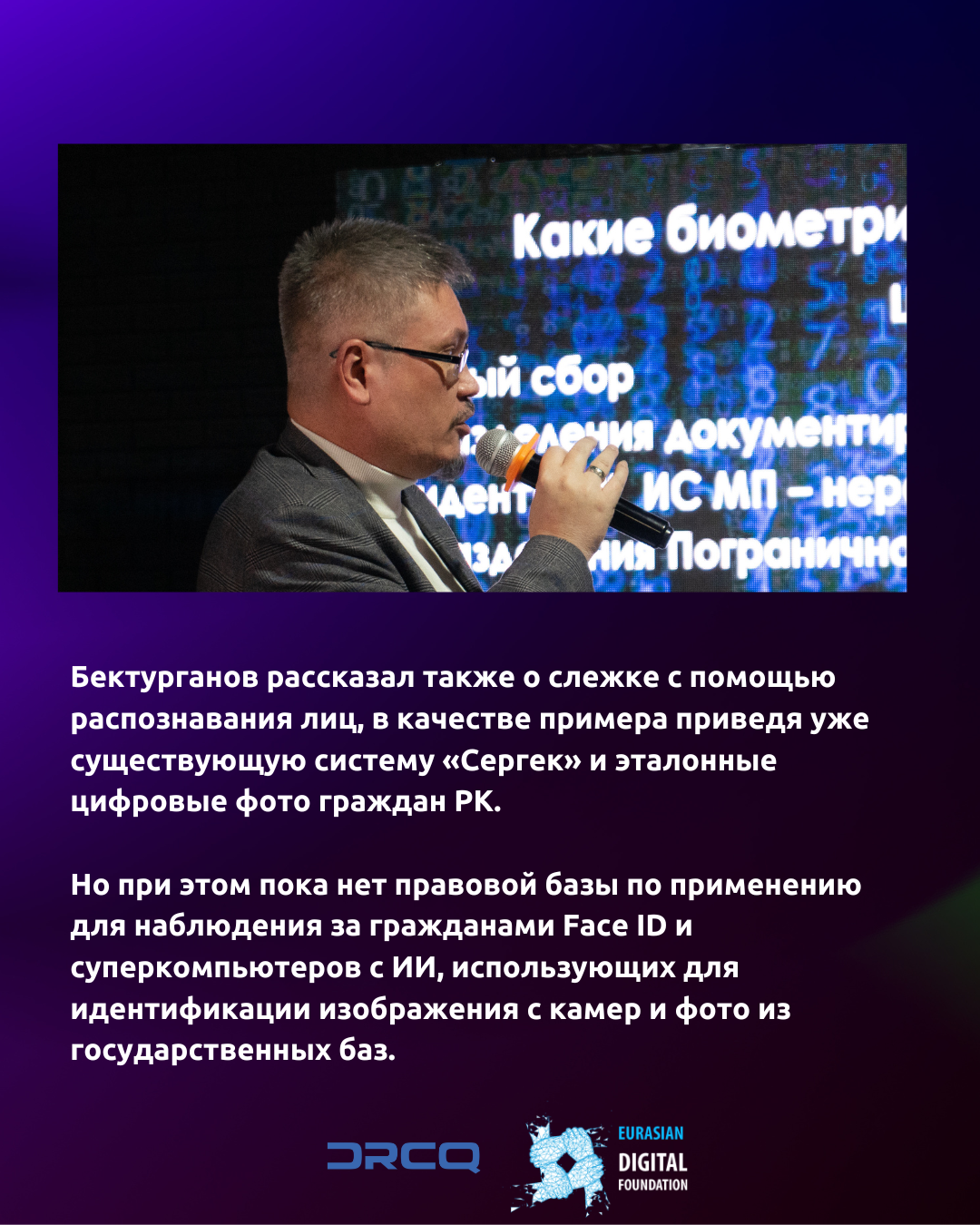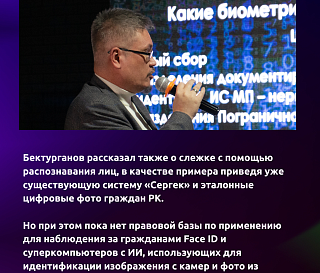 Рассказал эксперт и о слежке с помощью распознавания лиц, например, для этого уже есть система «Сергек» и эталонные цифровые фото граждан РК. Но правовой базы по использованию Face ID для наблюдения за гражданами и суперкомпьютеров с ИИ для идентификации с использованием изображений камер и фото из государственных баз пока не существует.