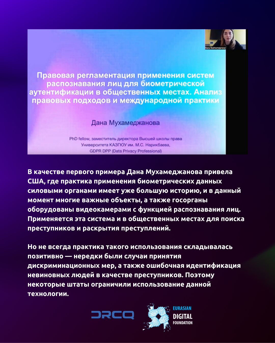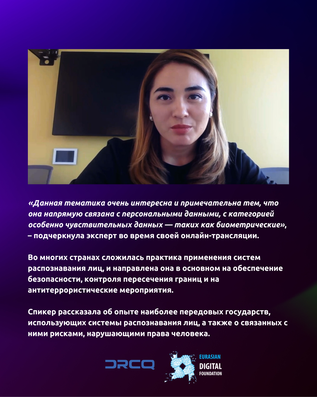 Замдиректора Высшей школы права Университета КАЗГЮУ, профессионал в сфере информационной приватности (GDPR DPP), юрист Дана Мухамеджанова рассказала о том, как в передовых странах применяются технологии биометрической идентификации, в частности - распознавание лиц.