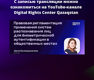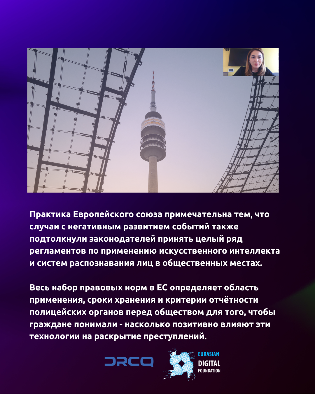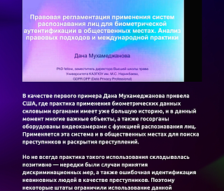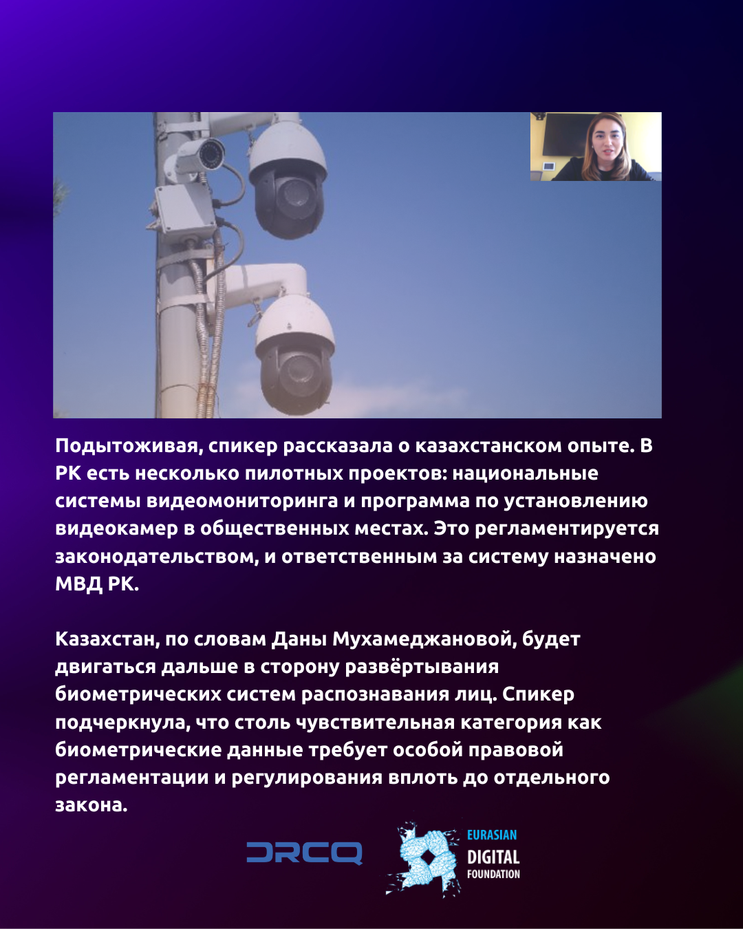 В конце выступления спикер рассказала о казахстанском опыте применения видеонаблюдения и распознавания лиц. В РК есть несколько пилотных проектов: национальные системы видеомониторинга, программа по установлению видеокамер в общественных местах. Регламентируется это соответствующими законодательными нормами, ответственным за систему будет МВД РК.