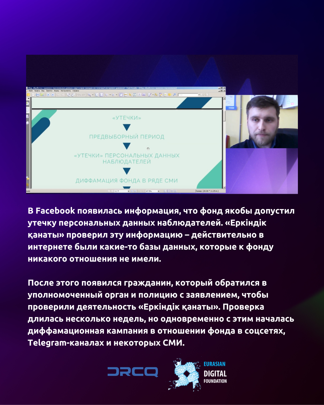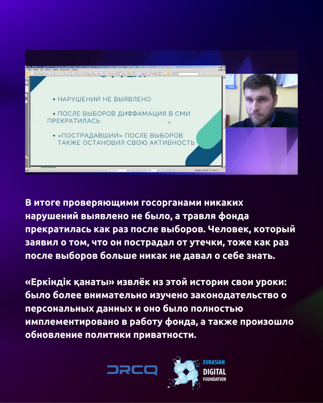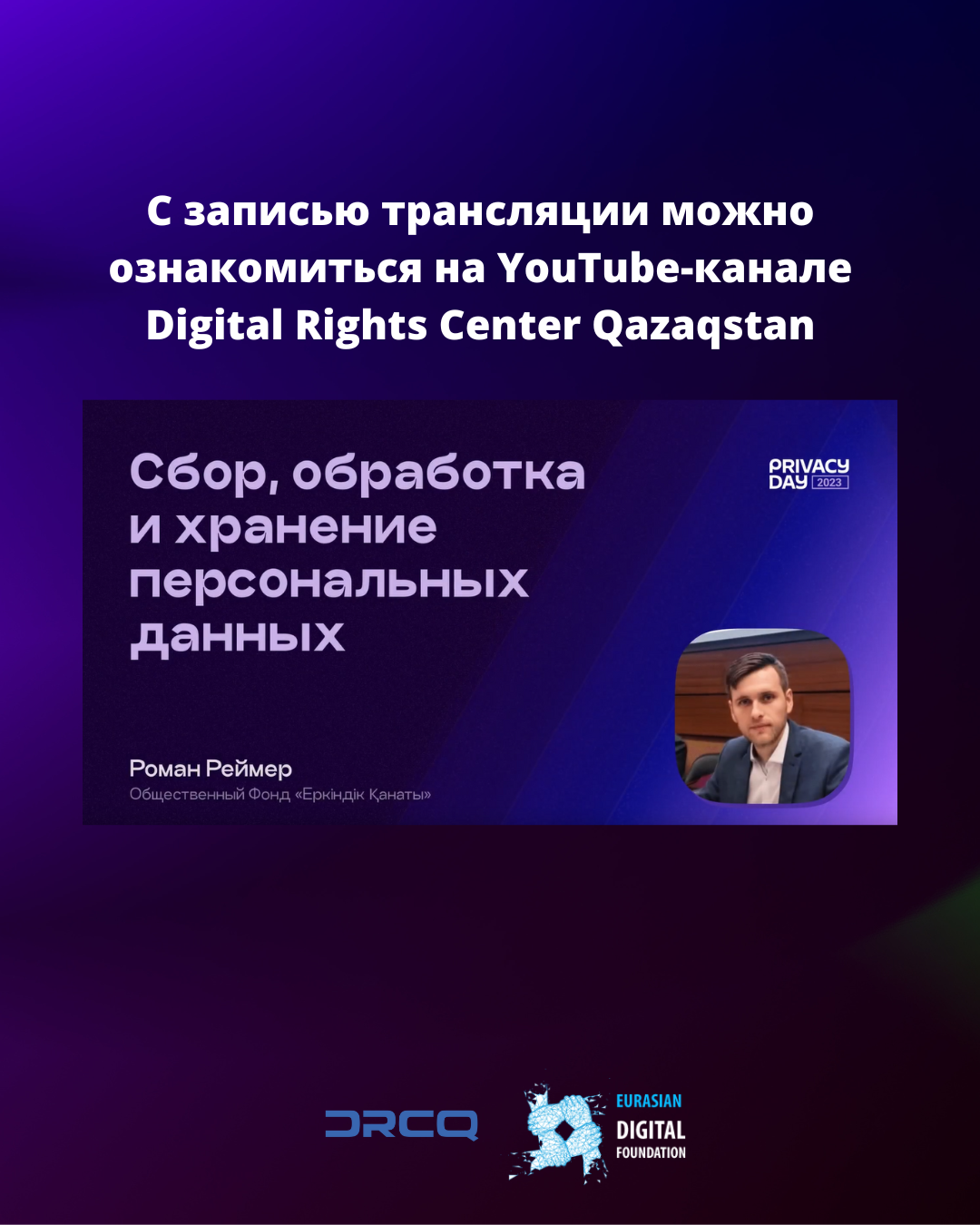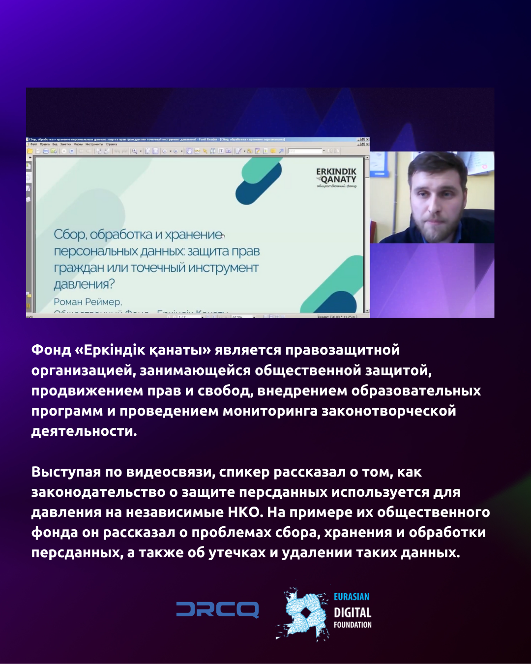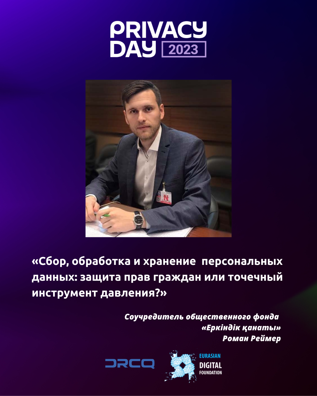 Продолжаем рассказывать о том, как проходила Международная конференция Privacy Day 2023. Роман Реймер, соучредитель общественного фонда «Еркіндік қанаты», выступил на ней с докладом «Сбор, обработка и хранение персональных данных: защита прав граждан или точечный инструмент давления?».
