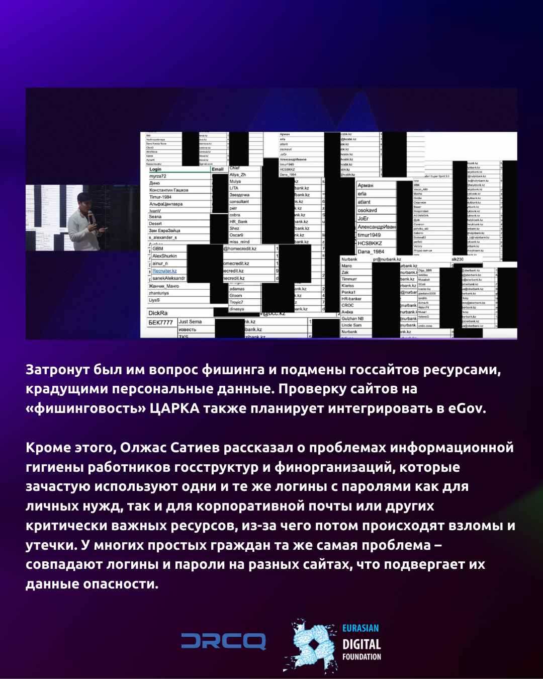 Кроме этого, Олжас Сатиев рассказал о проблемах информационной гигиены работников госструктур и финансовых организаций, которые зачастую используют одни и те же логины с паролями как для личных нужд, так и для корпоративной почты или других критически важных ресурсов, из-за чего потом происходят взломы и утечки. У многих простых граждан та же самая проблема – совпадают логины и пароли на разных сайтах, что подвергает их данные опасности.