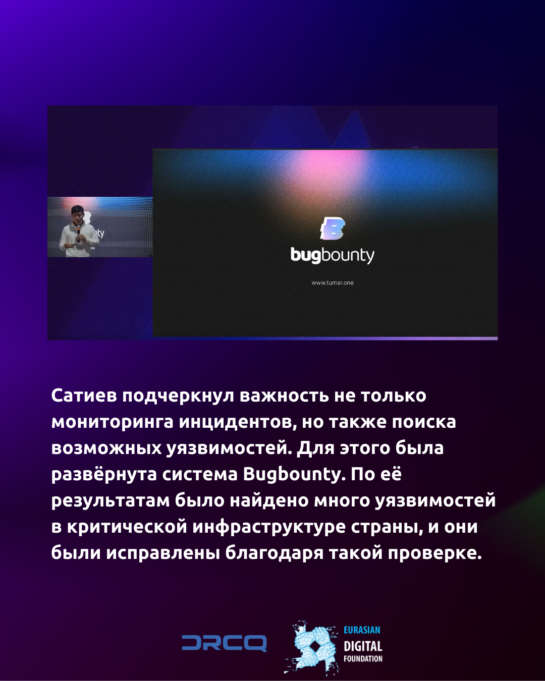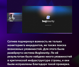 Эксперт подчеркнул важность не только мониторинга инцидентов, но также поиска возможных уязвимостей. Для этого была развёрнута система Bugbounty. По её результатам было найдено много уязвимостей в критической инфраструктуре страны, и они были исправлены благодаря такой проверке.