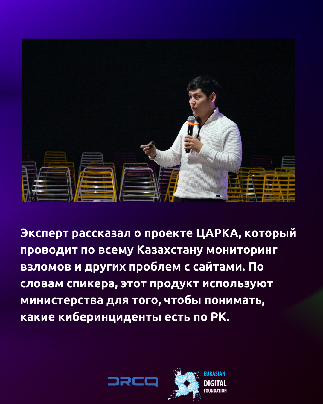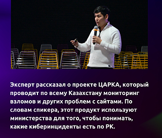 Эксперт рассказал о проекте ЦАРКА, который проводит по всему Казахстану мониторинг взломов и других проблем с сайтами. По словам спикера, этот продукт используют министерства для того, чтобы понимать, какие киберинциденты есть по РК.